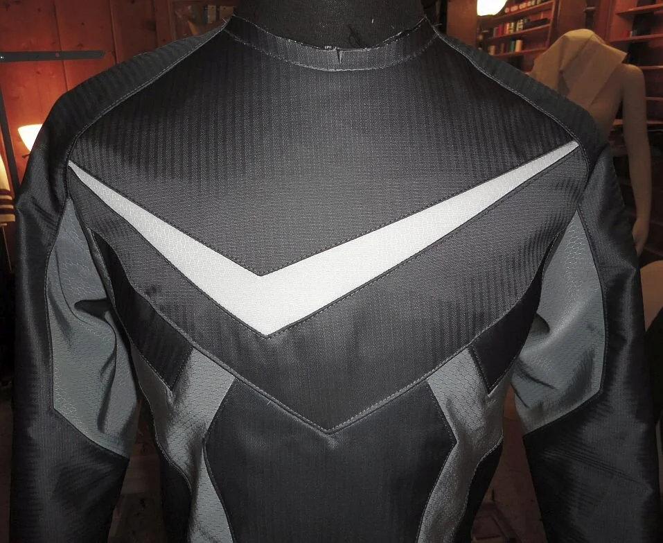 The clients wanted the costume to have some 'Tron" style elements - specifically, the Verizon "V" on the chest in bright white and a high-tech, streamlined look. Once the design was approved and the actor was cast, the patterns were drafted, and the costume was constructed.