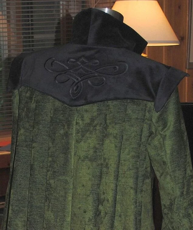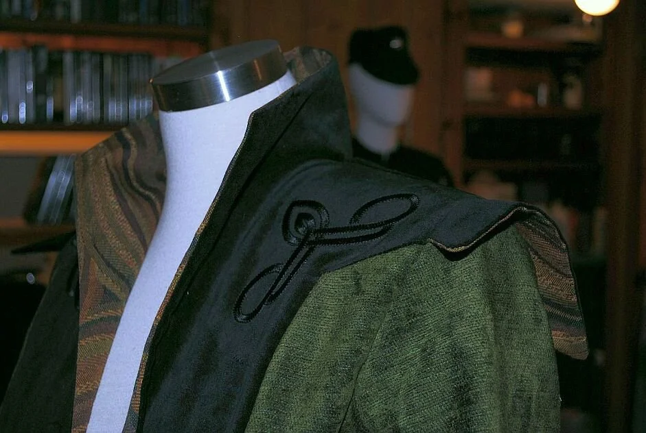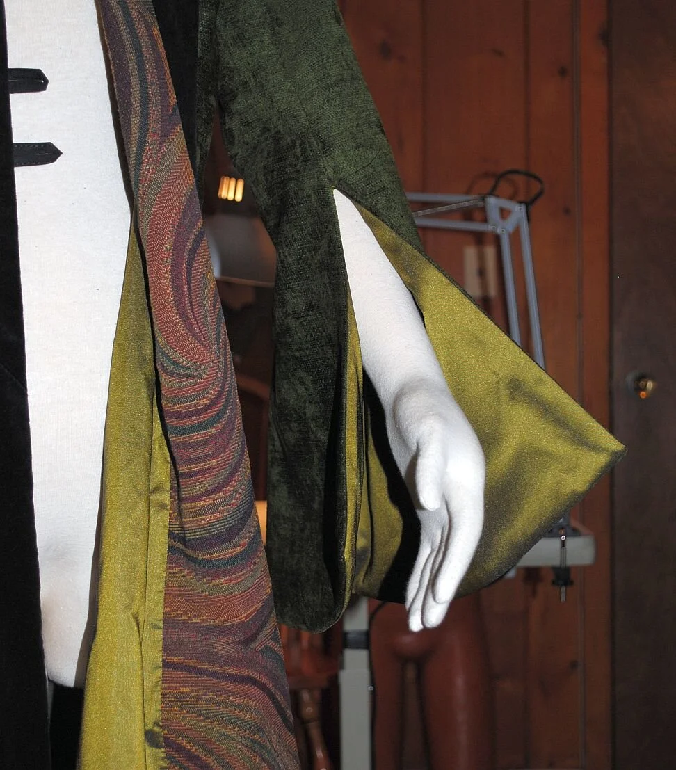 We settled on the Watteau-backed robe in green chenille and black velvet. The robe has a facing of peacock jacquard, and the gown underneath is a black crinkle crepe with a high collar. Gold buttons also fasten the front, and some embroidered motifs on the shoulders.